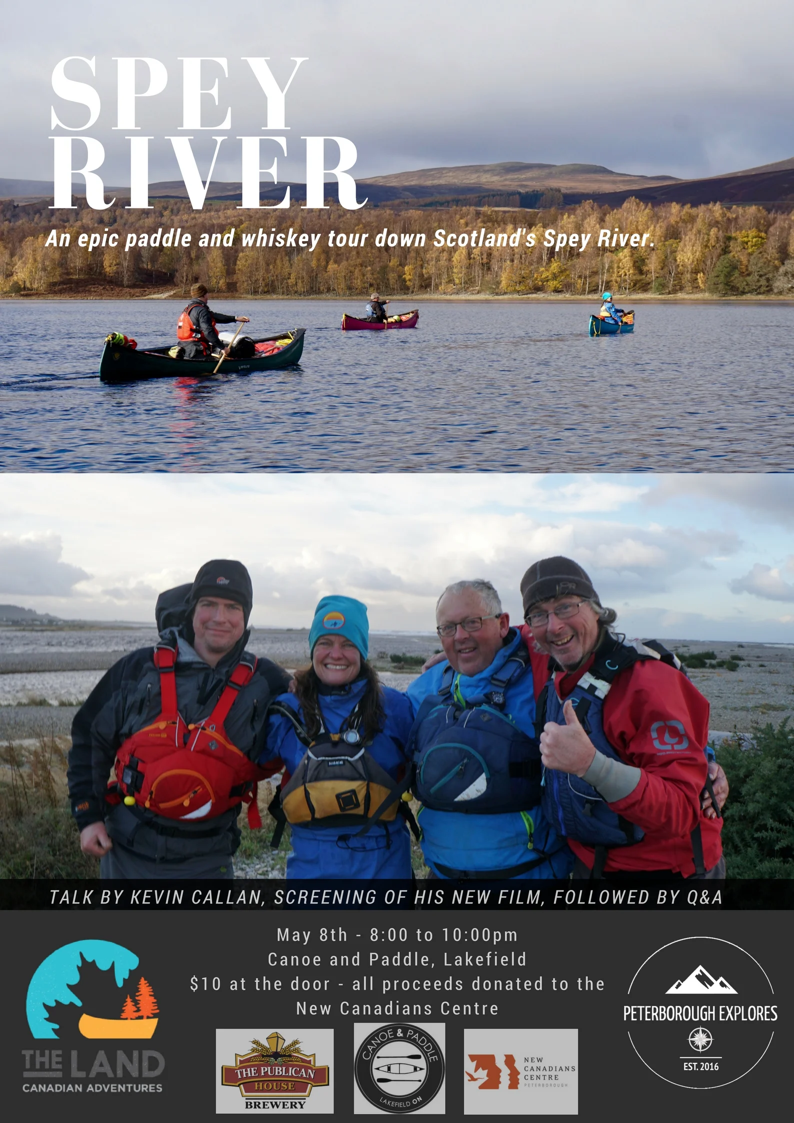 Come out and enjoy an evening of adventure with local paddling legend, Kevin Callan. He will be screening his adventure paddling down the Spey River in Scotland. This special night is being hosted by The Land: Canadian Adventures and us at Peterborough Explores. All proceeds will be donated to the New Canadians Centre in Peterborough. Their outdoor experiences program helps New Canadians experience what this amazing place has to offer. We are happy to be supporting such a great organization.